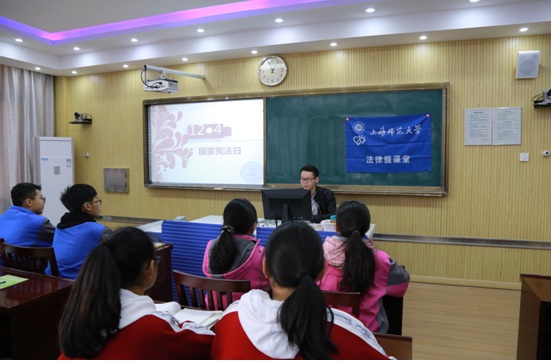 2017年12月4日是第4个国家宪法日,也是第17个全国法制宣传日。为深入贯彻党的十九大精神,切实提高学生的法治观念和法律意识,使尊法学法守法用法成为学生的共同追求和自觉行动。12月8日,阳光外国语学校邀请上海师范大学哲学和政法学院的志愿者团队为八年级的69名入团积极分子进行了一场精彩的法制讲座。