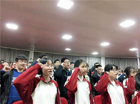 会议由年级组长杨水莲老师主持,会议内容分“信心篇”、“目标篇”、“方法篇”、“行动篇”四个板块。在鼓励学生信心时,先让两位学生代表发言。一位是九(3)班的龚陈晨,她在九年级第一学期的期中和一模考中,取得了显著的进步,主要谈了如何取得进步的以及迎接二模的具体措施。另一位是九(1)姜悦琳,她在一模中英语单科第一但有偏科现象,所以她谈的是如何克服偏科,让各科均衡发展。两位同学的发言给全体学生增强了信心。接着教导主任吴耀辉老师也给全体进行了动员鼓励,告诉学生们我们学校近几年出了两个中考状元以及许多单科状元,相信我们这一届也是有潜力的,号召学生全身心的投入复习迎考,争取在中考中再创辉煌。在杨水莲组长激情洋溢的带领下,全体学生进行了中考宣誓,把本次动员会带入了高潮。最后吴迅雷校长以“目标、激情、坚持”为关键词进行了总结讲话,鼓励全体九年级学生确立适合自己的目标,充满激情的学习,并坚持到六月的中考。