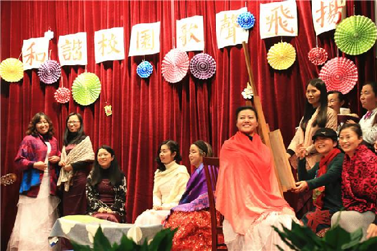 第三个上场的是三四年级组。他们可是盛装出席噢。女教师们身穿一身席地紫色纱裙;男教师身着金色滚边白衬衫。个个穿得比结婚的时候都要美!