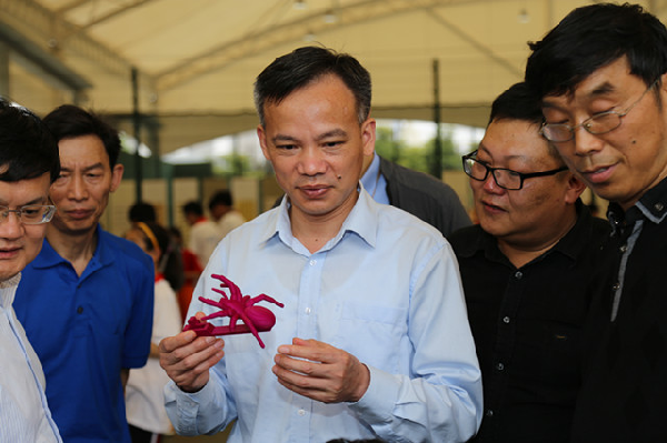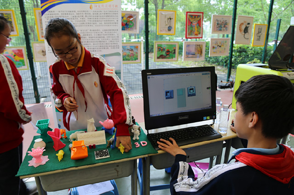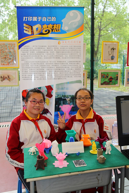 5月31日下午,已有夏天的微醺热闹,带着我校特色的3D打印技术,3位同学来到了区学生活动节闭幕式的现场展示平台。一人在现场操作建模软件,机器在旁即时打印出他的设计来,其他两人附以讲解。桌面上栩栩如生的象,形状各异的瓶,以及镌刻在作品上的字,无一不在宣告我校学生们在3D打印上的累累硕果。这赢得了他校学生、高中学子和教育局局长的留步驻足,作为纪念礼物,3D小象被送至他们手上,精巧的设计让人爱不释手。三维设计和3D打印技术意在把学生培养成有思想、有创意的设计者与思考者,我校正朝着这个目标,昂首阔步,走出自己的路。