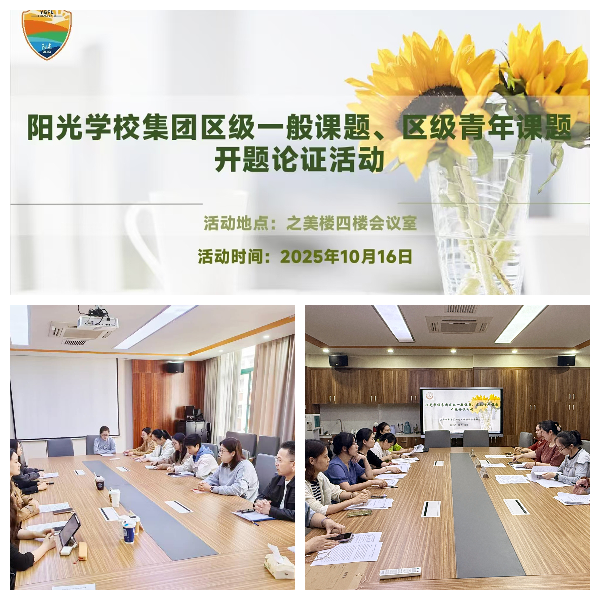 为深化教育科研改革,提升教师专业素养,2025年10月16日下午与10月23日下午,阳光学校教育集团在阳光外国语学校之远楼二楼会议室、之美楼四楼会议室分别进行了2025年度区级一般课题、区级青年课题开题论证活动。集团各校科研室主任、课题负责人及论证小组成员共同参与了本次活动。